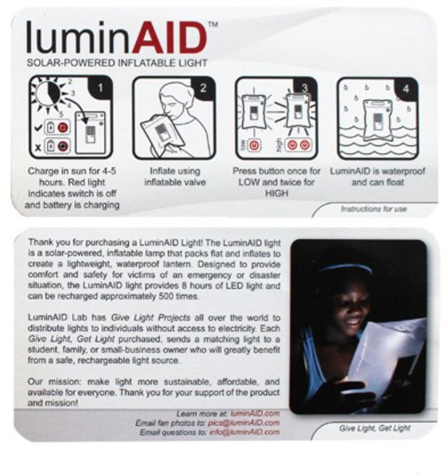 Comes with an instruction card and information on LuminAID Lab's Give Light Projects